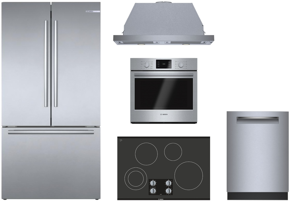 Bosch 5 Piece Stainless Steel Kitchen Package with French door refrigerator, built in dishwasher, single electric wall oven, electric cooktop and under cabinet range hood.Read More