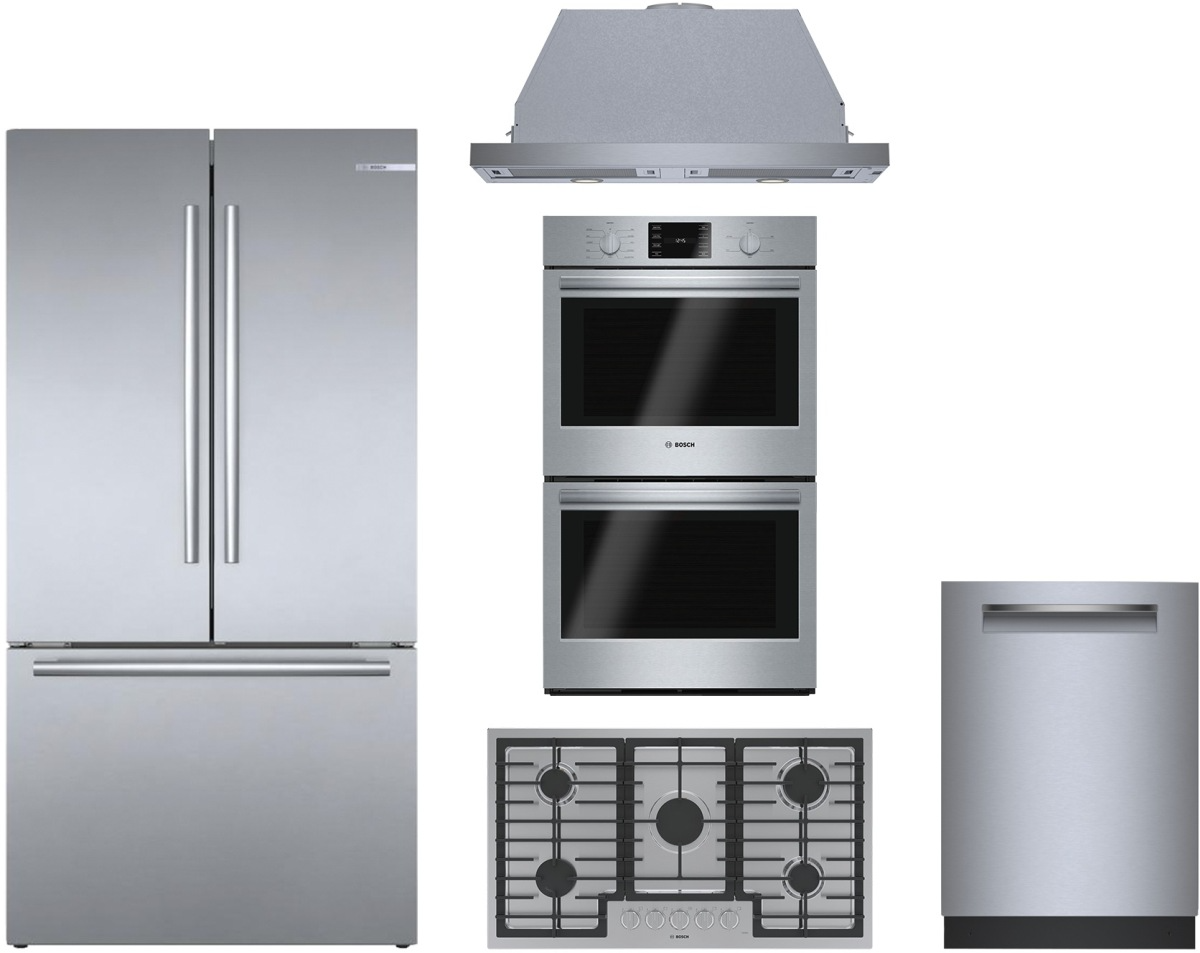 Bosch 5 Piece Stainless Steel Kitchen Package with French door refrigerator, built in dishwasher, double electric wall oven, gas cooktop and under cabinet range hood.Read More