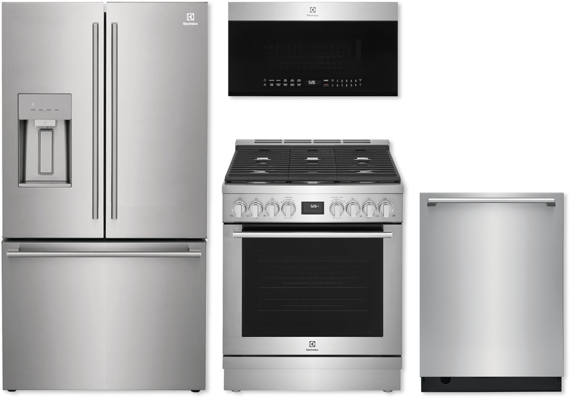 The Electrolux 4 Piece Stainless Steel Kitchen Appliance Package with a French door refrigerator, pro style gas range, built in dishwasher, and over the range convection microwave.Read More