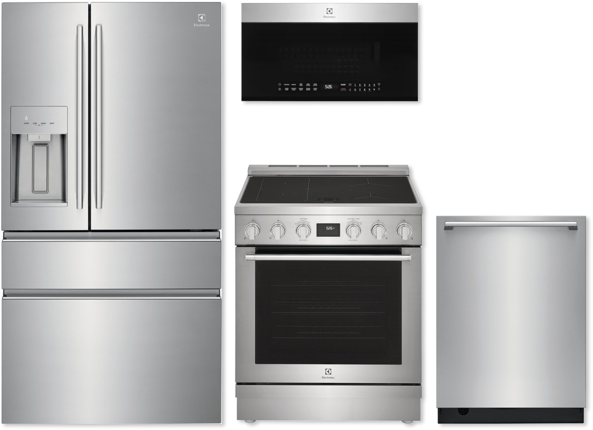 The Electrolux 4 Piece Stainless Steel Kitchen Appliance Package with a French door refrigerator, induction range, built in dishwasher, and over the range convection microwave.Read More