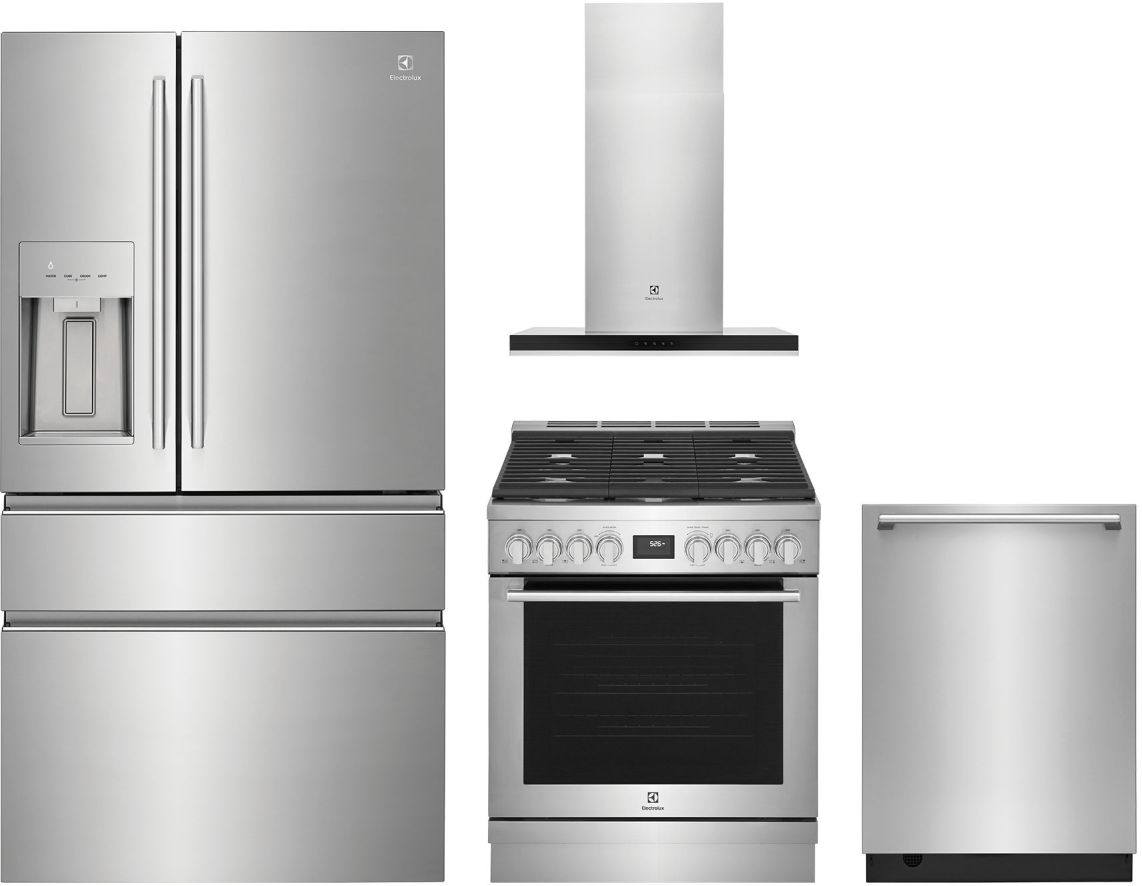 The Electrolux 4 Piece Stainless Steel Kitchen Package with a french door refrigerator, pro style gas range, built in dishwasher, and range hoodRead More