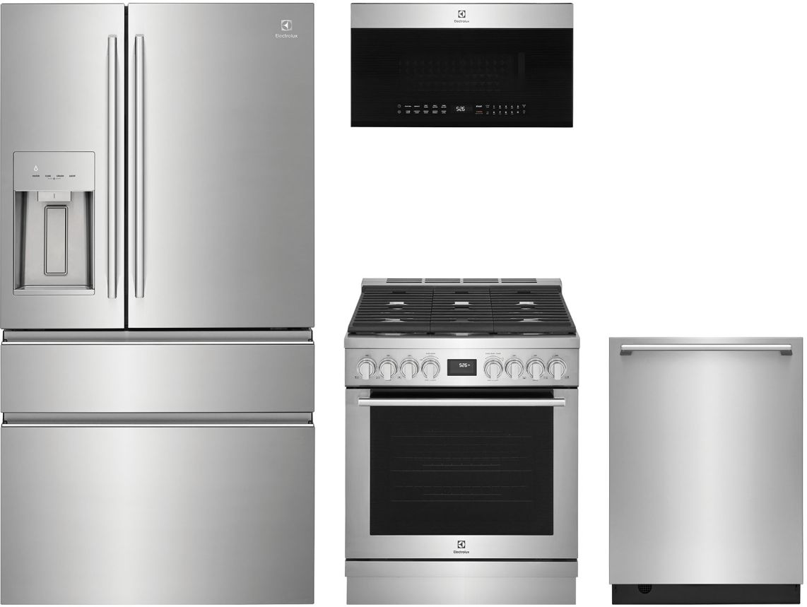 The Electrolux 4 Piece Stainless Steel Kitchen Package with a french door refrigerator, pro style gas range, built in dishwasher, and over the range convection microwave.Read More