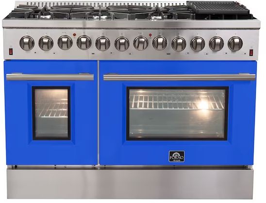 Introducing the Forno 48 Inch Galiano Dual Fuel Range, designed to bring professional style and quality to your kitchen with its robust stainless steel construction. This range features eight sealed burners, including a powerful 20,000 BTU double-ring burner, delivering a total of 107,000 BTU to meet all your cooking needs. Continuous cast-iron grates provide even heat distribution and stability for utensils. The enamel cooktop's recessed cavity ensures easy cleanup. It includes two electric ovens with a combined capacity of 6.58 cu. ft. and a total output of 9,700 Watts, housed in black enamel interiors with tempered three-layer glass doors. The right-side oven features a true convection system with a 1500 Watt fan heating element. Also included are an LP conversion kit, four electroplated oven racks, a griddle, and a NEMA 14-50P power cord. Zinc-coated metal knobs with bezel rings add a touch of lasting beauty.Read More