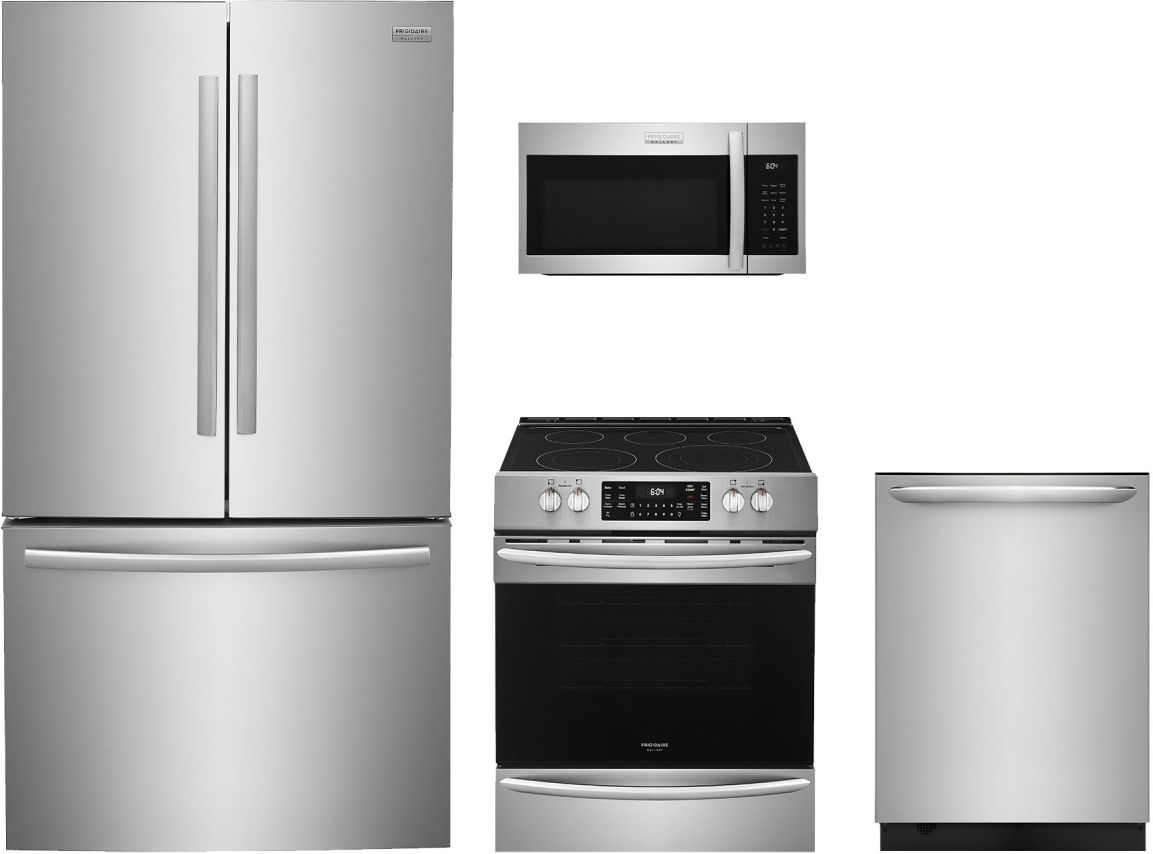 Frigidaire Gallery® 4 Piece Stainless Steel Kitchen Package with a french door refrigerator, over the range microwave, freestanding electric range, and a built in dishwasher.Read More