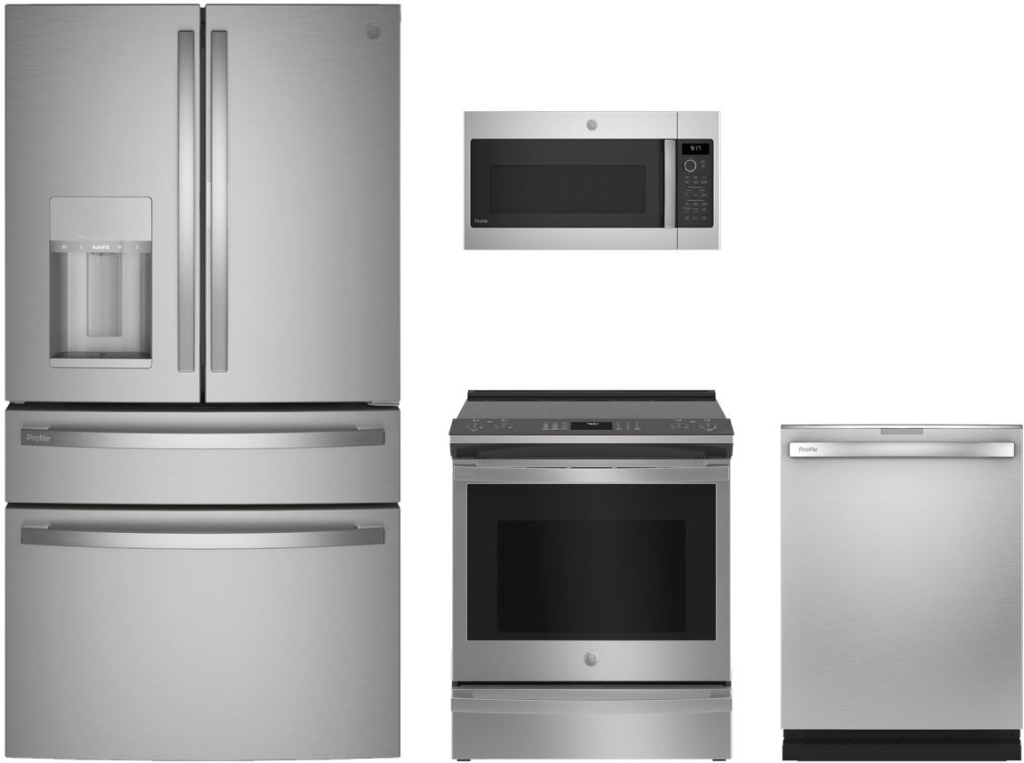GE Profile™ 4 Piece Stainless Steel Kitchen Package with a french door refrigerator, slide in electric range, built in dishwasher and over the range microwaveRead More