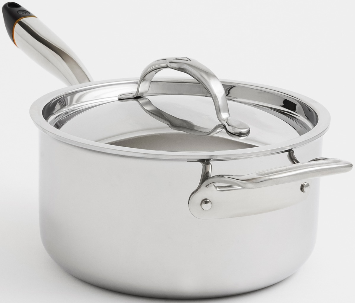 Tri-ply-clad non-reactive 18/10 stainless steel construction with a proprietary aluminum alloy core delivers quick and even heating.