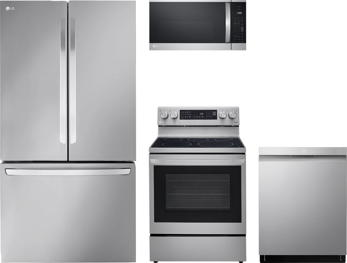 LG 4 Piece PrintProof™ Stainless Steel Kitchen Package with a French door refrigerator, freestanding electric range, built in dishwasher and over the range microwave.Read More