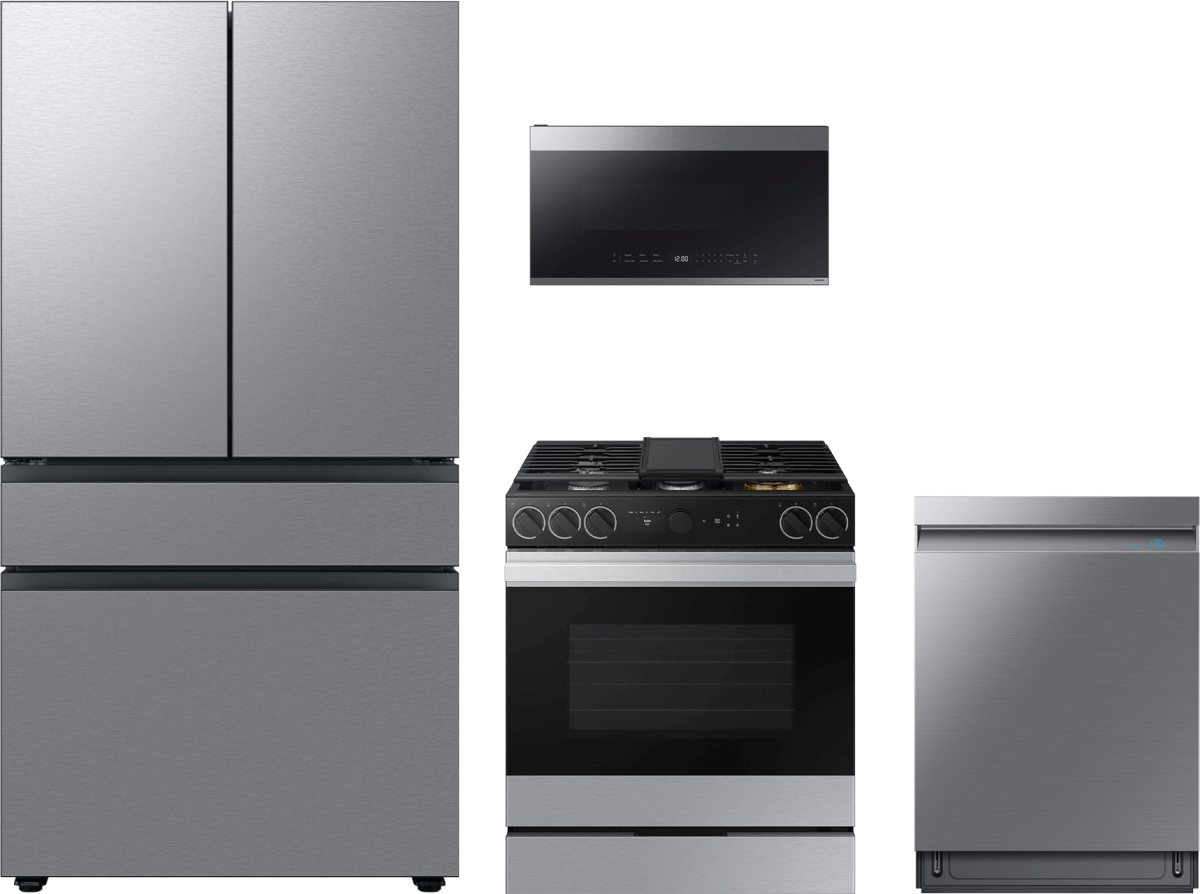Samsung 4 Piece Stainless Steel Kitchen Package with a french door refrigerator, slide in gas range, built in dishwasher and over the range microwaveRead More