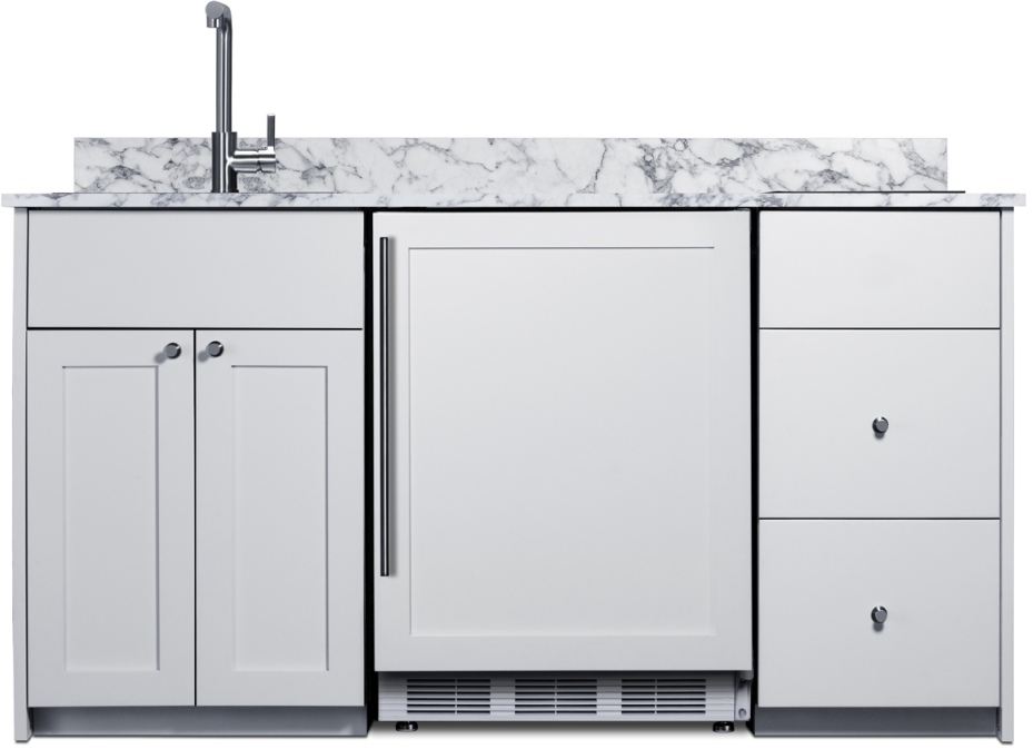 Summit's Turnkey Kitchens & Bars feature pre-installed cabinetry and matching appliances to bring effortless style & instant living to home bars, ADUs, tiny houses, rental properties, office break rooms, and hospitality settings. The Caldera is a 63" wide kitchenette in a classic white finish, sized just under 34" to comply with ADA guidelines for lower counter height. It features hardwood construction and a countertop made from a water-resistant laminate material with a marble look, with a pre-installed 2-burner induction cooktop included. We include a stainless steel sink with faucet and 5 Cu. Ft. refrigerator-freezer for food storage. For dry storage, this model has a two-door cabinet and two soft-close drawers.Read More