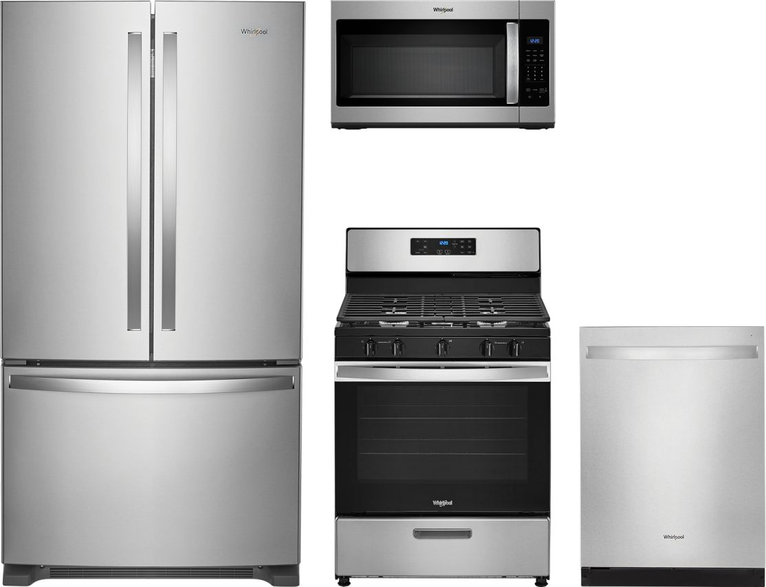 Whirlpool® 4 Piece Stainless Steel Kitchen Package with french door refrigerator, free standing gas range, over the range microwave, and built in dishwasherRead More